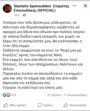 θυμάστε τον Δ.Νατσιό, σε κάθε προεκλογική ομιλία, να περηφανεύεται ότι ο Σπανουδάκης τους παραχώρησε το τραγούδι του «Ψυχή μου μη λυγίζεις», ως δήθεν «Ύμνο της Νίκης»; Αλλά οι κομματικές παρωπίδες, δεν αφήνουν τα κομματικά «πρόβατα» να δουν και στην περίπτωση αυτή την αλήθεια: