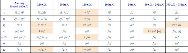 Μιὰ πολὺ χρήσιμη προσέγγιση γιὰ τὸ πῶς περίπου ἐξελίχθηκε ἡ προφορὰ τῶν ἑλληνικῶν γραμμάτων μέσα στοὺς αἰῶνες μπορεῖτε νὰ βρεῖτε στὸ παρακάτω ἀρχεῖο: