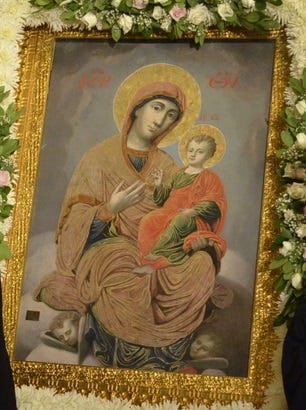 Η περίπυστος εικόνα της Παναγίας μεταφέρθηκε από τη Μικρά Ασία το 1922 μ.Χ., κατά την περίοδο της Εθνικής μας τραγωδίας και φυλασσόταν στο υπόγειο παρεκκλήσιο του Αγίου Δημητρίου, καθώς ήταν κατεστραμμένη από τη φωτιά και την φθορά του χρόνου. Όταν εν τέλει και μετά από πολλές προσπάθειες αποκαταστάθηκε, αποκαλύφθηκε μια μοναδική εικόνα της Παναγίας που στα πόδια Της κάθεται το Θείο Βρέφος.