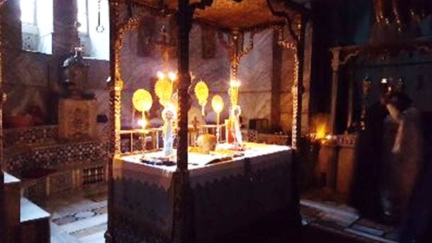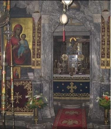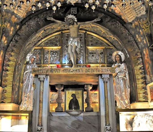 Ἰεροσόλυμα. Ὁ Φρικτός Γολγοθᾶς. Δεσπόζει ἐπὶ αἰώνες ὁ Ἐσταυρωμένος πίσω ἀπό τὴν ἁγία Τράπεζα. Οἱ ἐπίσκοποι ἐδῶ λειτουργοῦν ἀσκεπεῖς.