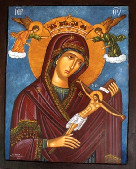 Παναγία τοῦ Χάρου 17ος αἱ. στούς Λειψούς. Ἡ θαυματουργή εἰκόνα εἶναι ἡ μοναδική τῆς Παναγίας πού δέν κρατᾶ τό Θεῖο Βρέφος, ἀλλά τόν Ἐσταυρωμένο Χριστό.
