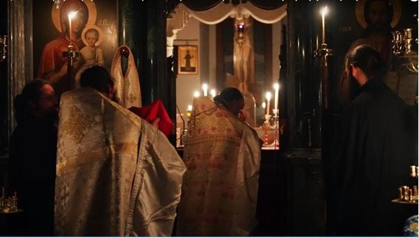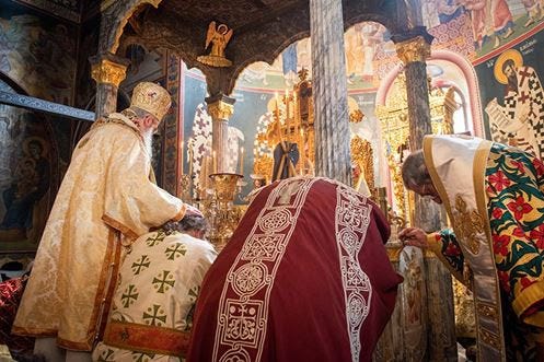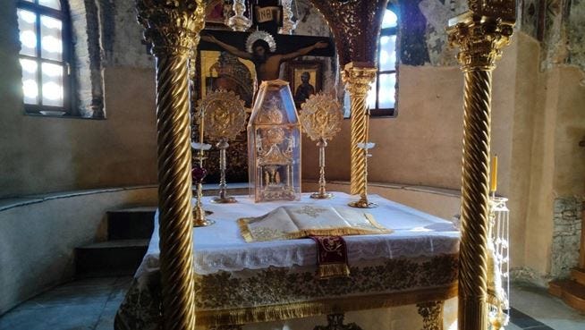 [45]. Πατριαρχική Θ.Λειτουργία στίς 4 Ἰουνίου 2024. Παρά τήν ἀναστάσιμη περίοδο ὁ Ἐσταυρωμένος (ζωγραφισμένος) διατηρεῖται πίσω ἀπό τήν ἁγία Τράπεζα.