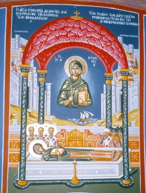 (Νὰ σημειώσουμε ὅτι ἡ κυρίως μνήμη τοῦ μαρτυρίου τῆς Ἁγίας Εὐφημίας τελεῖται στὶς 16 Σεπτεμβρίου).
