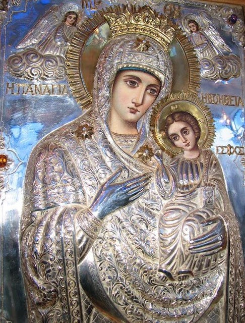Ἔχοντες Εἰκόνα Σου τήν σεπτήν, Ἀνύμφευτε Κόρη, ὡς προπύργιον ὀχυρόν, προστρέχομεν Ταύτῃ καιρῶ τῶ τῶν κινδύνων καί ἐπηρείας πάσης ἀπολυτρούμεθα.