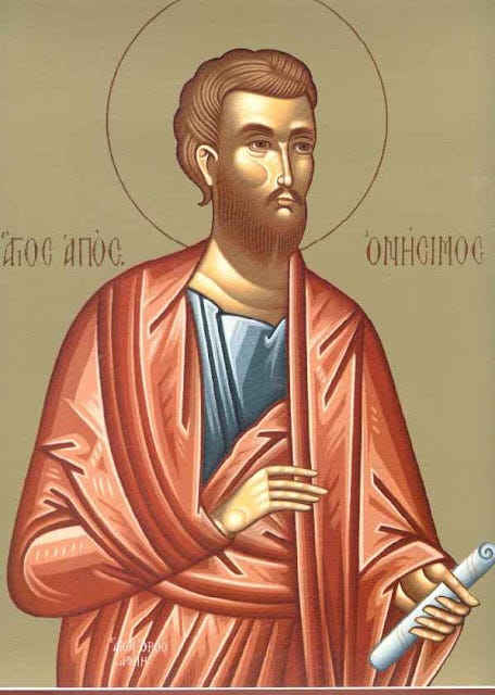 Ὁ Ἅγιος Ὀνήσιμος, ἕνας ἀπὸ τοὺς ἑβδομήκοντα Ἀποστόλους, ἦταν δοῦλος στὸ σπίτι τοῦ Ρωμαίου ἄρχοντα Φιλήμονος, ὁ ὁποῖος καταγόταν ἀπὸ τὴν Φρυγία καὶ ἔγινε Χριστιανὸς ἀπὸ τὸν Ἀπόστολο Παῦλο. Ὁ Ὀνήσιμος ἔφυγε κρυφὰ ἀπὸ τὸν κύριό του καὶ μετέβη στὴ Ρώμη σὲ ἐπίσκεψη τοῦ Ἀποστόλου Παύλου.