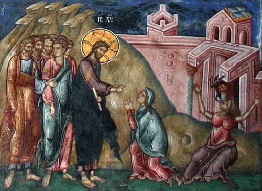 «Καὶ ἐξελθὼν ἐκεῖθεν ὁ ᾿Ιησοῦς ἀνεχώρησεν εἰς τὰ μέρη Τύρου καὶ Σιδῶνος. καὶ ἰδοὺ γυνὴ Χαναναία ἀπὸ τῶν ὁρίων ἐκείνων ἐξελθοῦσα ἐκραύγαζεν αὐτῷ λέγουσα· ἐλέησόν με, Κύριε, υἱὲ Δαύΐδ· ἡ θυγάτηρ μου κακῶς δαιμονίζεται (:Καὶ ἀφοῦ ἔφυγε ἀπὸ κεῖ ὁ Ἰησοῦς, ἀναχώρησε πρὸς τὰ μέρη τῆς Τύρου καὶ Σιδώνας. Τότε μιὰ γυναῖκα Χαναναία ποὺ βγῆκε ἀπὸ τὰ σύνορα ἐκεῖνα, Τοῦ φώναξε δυνατά: ''Ἐλέησέ με, Κύριε, ἔνδοξε ἀπόγονε τοῦ Δαβίδ. Ἡ κόρη μου κατέχεται ἀπὸ δαιμόνιο καὶ ὑποφέρει φρικτά'')» [Ματθ. 15,21-22].