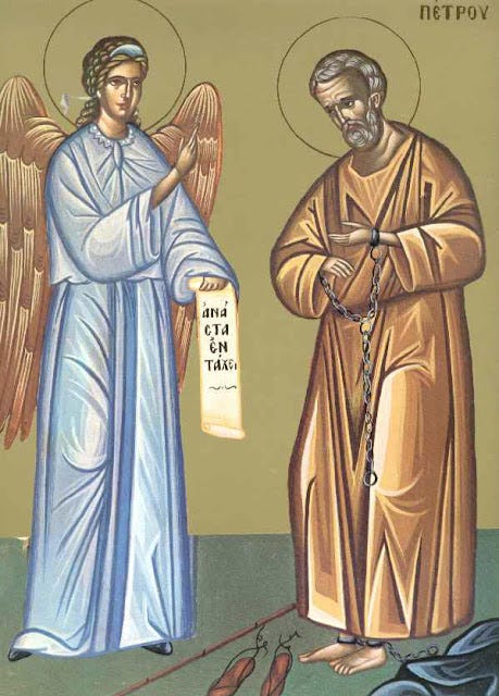 Ὁ Ἡρώδης ἔβαλε τοὺς Ἰουδαίους καὶ συνέλαβαν τὸν Ἀπόστολο Πέτρο κατὰ τὶς ἡμέρες τῆς ἑορτῆς τῶν ἀζύμων. Καὶ ὅταν τὸν ἔπιασε, τὸν ἔβαλε στὴν φυλακή. Τὴ νύκτα, πρὶν τὴν ἡμέρα κατὰ τὴν ὁποία ὁ Ἡρώδης ἔμελλε νὰ τὸν παρουσιάσει στὸν λαό, ὁ Ἀπόστολος Πέτρος κοιμόταν μεταξὺ δύο στρατιωτῶν καὶ φρουροὶ φύλαγαν μπροστὰ στὸ κελί του. Ξαφνικὰ ἦλθε Ἄγγελος Κυρίου καὶ ἔλαμψε φῶς στὸ κελί. Ἀφοῦ κτύπησε τὴν πλευρὰ τοῦ Πέτρου, τὸν ξύπνησε καὶ τοῦ εἶπε: «Σήκω γρήγορα». Καὶ ἔπεσαν οἱ ἁλυσίδες ἀπὸ τὰ χέρια του.