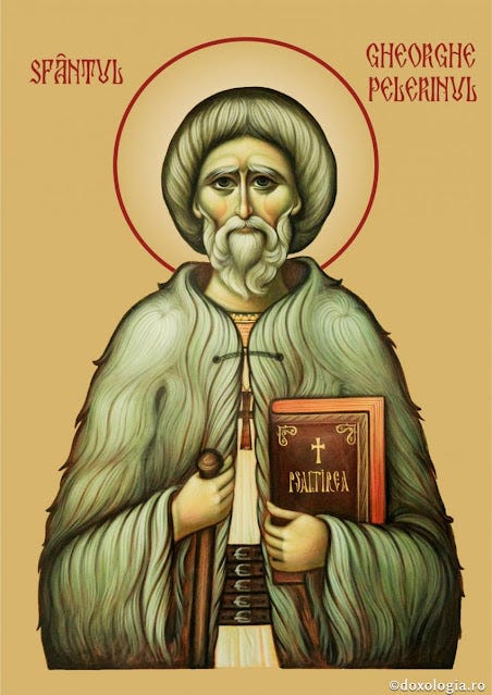 8) Έλεγαν οι μαθητές του ότι ο γέρο-Γεώργιος δεν έμεινε πολύ καιρό στο Σουγκάγκ, στην πατρίδα του. Αφού κανόνισε τις οικογενειακές του υποχρεώσεις, έφυγε ως προσκυνητής για τα μοναστήρια και τις σκήτες. Σκεπασμένος με μια προβειά, ξυπόλυτος, χωρίς σκούφο, με το ψαλτήρι στην μασχάλη και το ραβδί στο χέρι, ο καλός προσκυνητής μετέβαινε από χωριό σε χωριό, από μοναστήρι σε μοναστήρι, λέγοντας την καρδιακή ευχή και τους ψαλμούς του Δαβίδ. Την ημέρα οδοιπορούσε ενώ το βράδυ, έμενε σ’ ένα τόπο, κοντά στην εκκλησία του χωριού. Αφού αναπαυόταν μερικές ώρες, έμπαινε στην εκκλησία και προσευχόταν εκεί μόνος του με την νοερά προσευχή μέχρι το πρωί. Κατόπιν αναχωρούσε για πιο πέρα. Έτσι αγωνίσθηκε ο γέρο-Γεώργιος τρία χρόνια, διερχόμενος την Τρανσυλβανία και Μουντένια, προσευχόμενος στις εκκλησίες και τα μοναστήρια ως ένας αληθινός προσκυνητής της Ορθοδόξου Εκκλησίας μας.