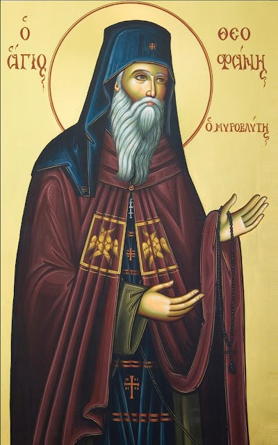 Ὡς Μυροβλύτης, θείου Πνεύματος τὰ νάματα, καὶ ὡς θαυμάτων αὐτουργὸς πᾶσιν ἰάματα, τοῖς τιμῶσί σε παρέχεις ἀφθονοδότως· μοναζόντων δὲ κανὼν ὑπάρχων ἄριστος, ὁδηγὸς γενοῦ ἡμῖν πρὸς τελειότητα, ἵνα κράζωμεν· Χαῖρε Πάτερ Θεόφανες.
