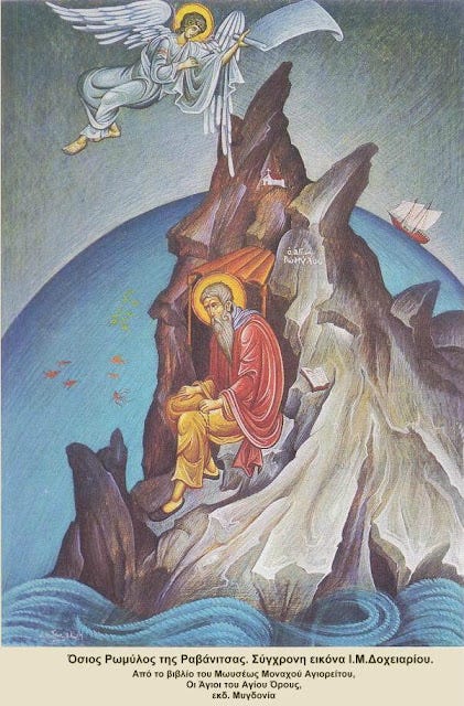 όμως σε επιδρομές τους κατέστρεψαν το μοναστήρι, και ο όσιος Ρωμύλος με τον μαθητή του Γρηγόριο κατέφυγαν στο Άγιον Όρος, όπου εγκαταστάθηκαν στα Μελανά, κοντά στην Μεγίστη Λαύρα. Οι αγιορείτες μοναχοί σύντομα
