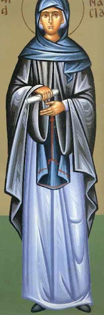Φροντίζοντας πάντοτε γιὰ τὴν σωτηρία τῆς ψυχῆς της, ἡ Ὁσία προσευχόταν ἀδιάλειπτα καὶ προσέφερε ἀφειδῶς ἀπὸ τὰ πλούτη της στοὺς ἐνδεεῖς καὶ πάσχοντες. Ὕστερα δὲ ἀπὸ κάποιο χρονικὸ διάστημα, ἔπεισε τὸν σύζυγό της νὰ γίνει μοναχός, ἂν καὶ ἦταν ἐθνικός. Αὐτός, ἀφοῦ πρόκοψε στὶς ἀρετές, μετὰ ἀπὸ λίγο χρόνο παρέδωσε τὴν ψυχή του στὸν Κύριο.
