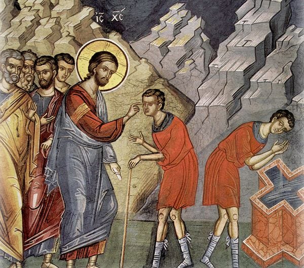 Ἀκούσαμε, ἀδελφοί μου, καὶ σήμερα τὸ εὐαγγέλιο (βλ. Λουκ. 18,35-43). Τί λέει; Εἶνε ἡ ἱστορία ἑνὸς ταπεινοῦ ἀνθρώπου, ἑνὸς τυφλοῦ. Τί μᾶς λέει; Ὅτι στὰ χρόνια τοῦ Χριστοῦ σὲ κάποιο σταυροδρόμι μιᾶς μικρᾶς πόλεως, ποὺ ὠνομαζόταν Ἰεριχώ, στεκόταν ἕνας ἄνθρωπος. Καλοκαίρι κάτω ἀπὸ τὸν καυστικὸ ἥλιο, χειμῶνα μέσα στὸ ψῦχος, στεκόταν ἐκεῖ καὶ ζητοῦσε τὴν ἐλεημοσύνη τῶν διαβατῶν, ἀφοῦ ἦταν τυφλός. Κάποιο σπλαχνικὸ χέρι τὸν ἔφερνε ἐκεῖ τὸ πρωὶ καὶ τὸν ἔπαιρνε τὸ βράδυ νὰ πάῃ στὸ σπίτι του νὰ κοιμηθῇ. Ζωὴ μέσα σὲ σκοτάδι ἀπέραντο. Δὲν ἔβλεπε τίποτε ἀπὸ τὰ ὡραῖα ποὺ δημιούργησε ὁ Θεός. Ἄχ πόσο ἀχάριστοι εἴμαστ᾽ ἐμεῖς, ποὺ μᾶς ἔδωσε ὁ Θεὸς τὰ μάτια κ᾿ ἕνα εὐχαριστῶ δὲν τοῦ λέμε!