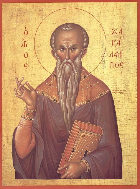 Τῇ δεκάτῃ Χαράλαμπες, ἐὸν ἐτμήθης ἀπὸ λαιμόν.