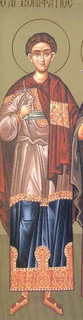 Μαρτύρων τὴν εὔκλειαν, ἰχνηλατήσας θερμῶς, Χριστὸν ὡμολόγησας, ἐπὶ ἀπίστων στερρῶς, σοφὲ Βονιφάτιε· ὅθεν καθάπερ πλοῦτον, ἀδαπάνητον Μάρτυς, δέδωκας σοῦ τὸ σῶμα, τῇ σεμνῇ Ἀγλαΐᾳ· ἐξ οὗ τῷ κοσμῷ πηγάζει, ῥῶσις καὶ ἔλεος.