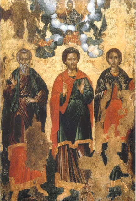 Εὐαγγελίου τοῦ Χριστοῦ. τοὺς νόμους ἐκπληροῦντες, ᾶγίαν ἔζησαν ζωὴν, ἐν μέσῳ τύρβης κοσμικῆς, αὐτάδελφοι οἰ θεῖοι· τὸ ἓν γὰρ Φρονήσαντες μιᾷ προθέσει ἀληθεῖ, ὅσα εὔφημα καί σεμνὰ, ὅσα δίκαια καί ἁγνὰ, ἐνεκολπώθησαν προθύμως. ἅπαν πρόσολον καί γεῶδες νόημα ἀποβάλλοντες· ἐντεῦθεν ἐν νηστείᾳ διηνεκεῖ, καὶ ἀγρυπνίᾳ συντόνῳ καὶ εὐχῇ ἀκαταπαύστῳ, ἡσύχως διαβιοῦντες, τὸν ἐν Αγίοις ἀναπαυόμενον, ἁγιοπρεπῶς ἐδόξασαν Λόγον ᾧ καί πρεσβεύουσιν ὑπὲρ ἡμῶν τῶν βοώντων αὐτοῖς συμφώνως· χαίρετε Ἄρτης βλαστοὶ εὐθαλέστατοι.