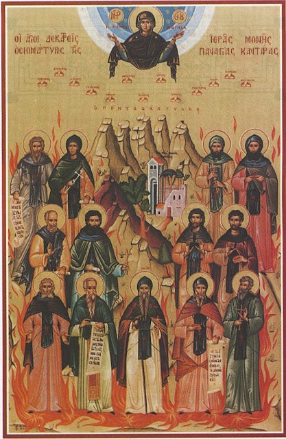 Μέσα ἀπὸ τὸ φωτόλαμπρο νέφος τῶν δαδοφόρων ἡρωικῶν ἀθλητῶν τῆς Κυπριακῆς Ἐκκλησίας, ὁλόφωτες προβάλλουν οἱ μορφὲς τῶν ἁγίων δεκατριῶν Μοναχῶν καὶ Ὁμολογητῶν τῆς ἱερὰς μονῆς Παναγίας Καντάρας.