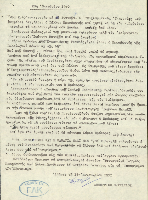(σ.σ. Στὸ τέλος τοῦ ἄρθρου παραθέτουμε ἱστορικὸ ντοκουμέντο γιὰ τὴν 28η Ὀκτωβρίου 1940, σχετικὸ μὲ τὴν συνομιλία τοῦ Πρεσβευτοῦ Γκράτσι καὶ τοῦ Πρωθυπουργοῦ Μεταξᾶ)