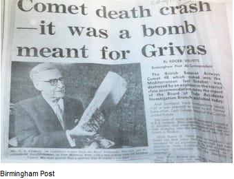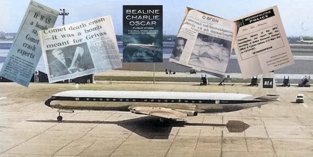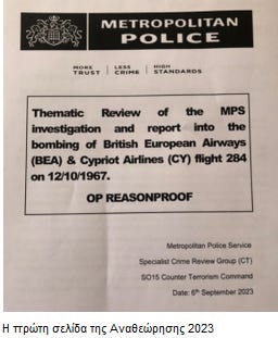 Αποδεσμεύθηκε σήμερα (25.10.23) το πόρισμα της πρόσφατης Αστυνομικής Αναθεώρησης (Review) για την έρευνα που διεξήγαγε η ίδια Μητροπολιτική Αστυνομία το 1968 για την ανατίναξη του αεροπλάνου των Βρετανικών Ευρωπαϊκών Αερογραμμών Κομήτη 4Β πτήσης Κυπριακών Αερογραμμών CY 284 12 Οκτωβρίου 1967 από Αθήνα προς Λευκωσία. Και το οποίο έπεσε στην περιοχή Καστελόριζου μοιρασμένο στα δύο από έκρηξη βόμβας, με θύματα όλους τους επιβάτες και το πλήρωμα σύνολο 66 αθώων ψυχών.