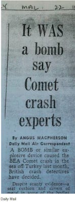 «…material recovered from the crash site included a Comet tourist class cabin seat cushion that, when examined, provided conclusive metallurgical evidence that it had been subjected to the effects of a detonation of high ‘military grade’ explosive material. As a result of these findings, a formal written request submitted in 1968 by the Under Secretary, Civil Aviation Department, Board of Trade, to the MPS requesting a formal investigation…»
