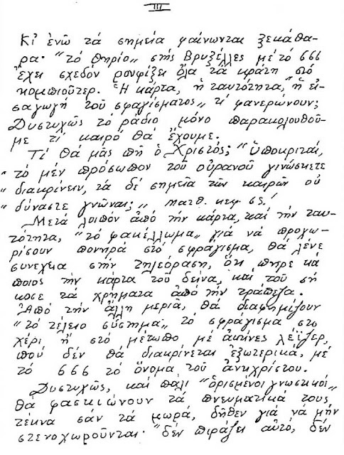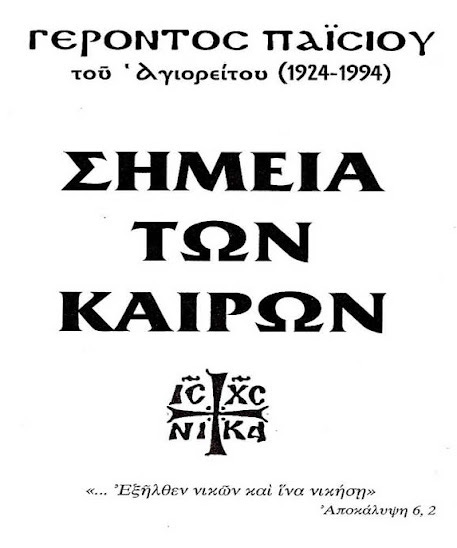 Ἀνάμεσά τους βεβαίως ξεχωρίζει ὁ Ἅγιος Παΐσιος, ποὺ ἕως τὴ στιγμὴ τῆς κοιμήσεώς του (1994) μίλησε πολλὲς φορὲς γιὰ τὰ σημεῖα τῶν ζοφερῶν καιρῶν μας καὶ μάλιστα μᾶς ἄφησε ἐπ' αὐτῶν καὶ ἕνα ἀπὸ τὰ ἐλάχιστα γραπτά του, ἐπειδὴ ἀκριβῶς γνώριζε (ὅπως καὶ ὁ ἴδιος ὁμολογεῖ) ὅτι τὰ προφορικὰ μποροῦν νὰ διαστρεβλωθοῦν, ὁπότε ἤθελε νὰ ἀφήσει στοὺς συγχρόνους καὶ ἰδίως στοὺς μεταγενεστέρους του συγκεκριμένους λόγους, τὴν αὐθεντικότητα τῶν ὁποίων κανεὶς δὲν θὰ μποροῦσε νὰ ἀμφισβητήσει.