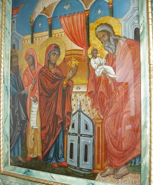 Τὸ γράμμα τῶν ἐντολῶν αὐτῶν πληροῦντες ὁ Ἰωσὴφ καὶ ἡ Παρθένος Μαρία, ἀνῆλθαν τὴν τεσσαρακοστὴ ἡμέρα ἀπὸ τῆς γεννήσεως τοῦ Χριστοῦ στὸ ναὸ τῶν Ἱεροσολύμων, γιὰ νὰ προσφέρουν τὸν Ἰησοῦ στὸν Θεὸ καὶ νὰ δώσουν τὴν θυσία περὶ καθαρισμοῦ. Τὸ ζευγάρι ὑποδέχθηκε στὸ ναὸ ὁ ὑπερήλικας Προφήτης Συμεών, ὁ ὁποῖος δέχθηκε τὸν Ἰησοῦ στὴν ἀγκαλιά του φωτισμένος ἀπὸ τὸ Ἅγιο Πνεῦμα, ἔχοντας λάβει ἀποκάλυψη ἀπὸ Αὐτὸ ὅτι δὲν θὰ ἀπέθνησκε πρωτοῦ δεῖ Ἐκεῖνον, τὸν ὁποῖο ὁ Κύριος καὶ Θεὸς ἔχρισε Βασιλέα καὶ Σωτῆρα τοῦ κόσμου.