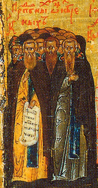Αἵμασιν οἰκείοις μαρτυρικῶς, τοὺς σαυτῶν χιτῶνας, πορφυρώσαντες ἱερῶς, πρὸς ὑπερκοσμίους, ἀνήλθετε ἐπαύλεις, φαιδρῶς κεκοσμημένοι, Πατέρες Ὅσιοι.