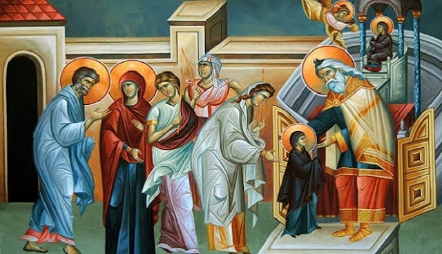 Έτσι, το ίδιο συνέβη και με την Υπεραγίαν Θεοτόκον. Οι γονείς της, ο Ιωακείμ και η Άννα, θερμά παρεκάλεσαν να τους δώσει παιδί, και αν τους έδινε, θα το αφιέρωναν στον Θεό. Και πράγματι, όταν εγεννήθη το παιδί τους, η Μαρία, την απεγαλάκτισαν, διότι έτσι εσυνηθίζετο τότε, εις ηλικίαν τριών ετών. Και μόλις απεγαλακτίσθη, δηλαδή έκοψαν το γάλα το μητρικό, προσέφεραν το μικρό παιδάκι εις τον ναόν. Και οι ιερείς οδήγησαν το κοριτσάκι αυτό, των τριών ετών, την τριετίζουσα Μαρία, εις τα Άγια των Αγίων. Εκεί ουδείς εισήρχετο, ούτε ιερεύς, παρά μόνον ο αρχιερεύς, και αυτός μόνο μία φορά τον χρόνο! Και συνεπώς η παρουσία της Υπεραγίας Θεοτόκου ήτο κατ’ έμπνευση του Θεού να βρίσκεται εκεί, εις τα Άγια των Αγίων.