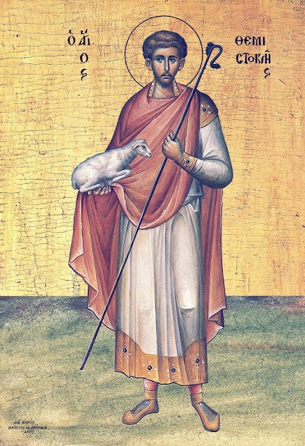 Σήμερα ἡ Ἐκκλησία τιμᾶ τὴν μνήμη τοῦ Ἁγίου Θεμιστοκλέους, ὁ ὁποῖος καταγόταν ἀπὸ τὰ Μύρα τῆς Λυκίας καὶ ἔζησε τὴν ἐποχὴ τοῦ αὐτοκράτορα Δεκίου. Ἦταν βοσκὸς στὸ ἐπάγγελμα.