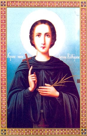 Ιδρώσιν ασκήσεως προστομωθείς Αθλητά, τους πόνους υπήνεγκας του μαρτυρίου στερρώς, Ευθύμιε ένδοξε` έδραμες γαρ ως γίγας, αποθέσθαι την πλάνην, φέρων εν ταις χερσί σου τον Σταυρόν και Βάϊα, , μεθ ων και στεφανηφόρος Χριστώ, χαίρων παρίστασαι.