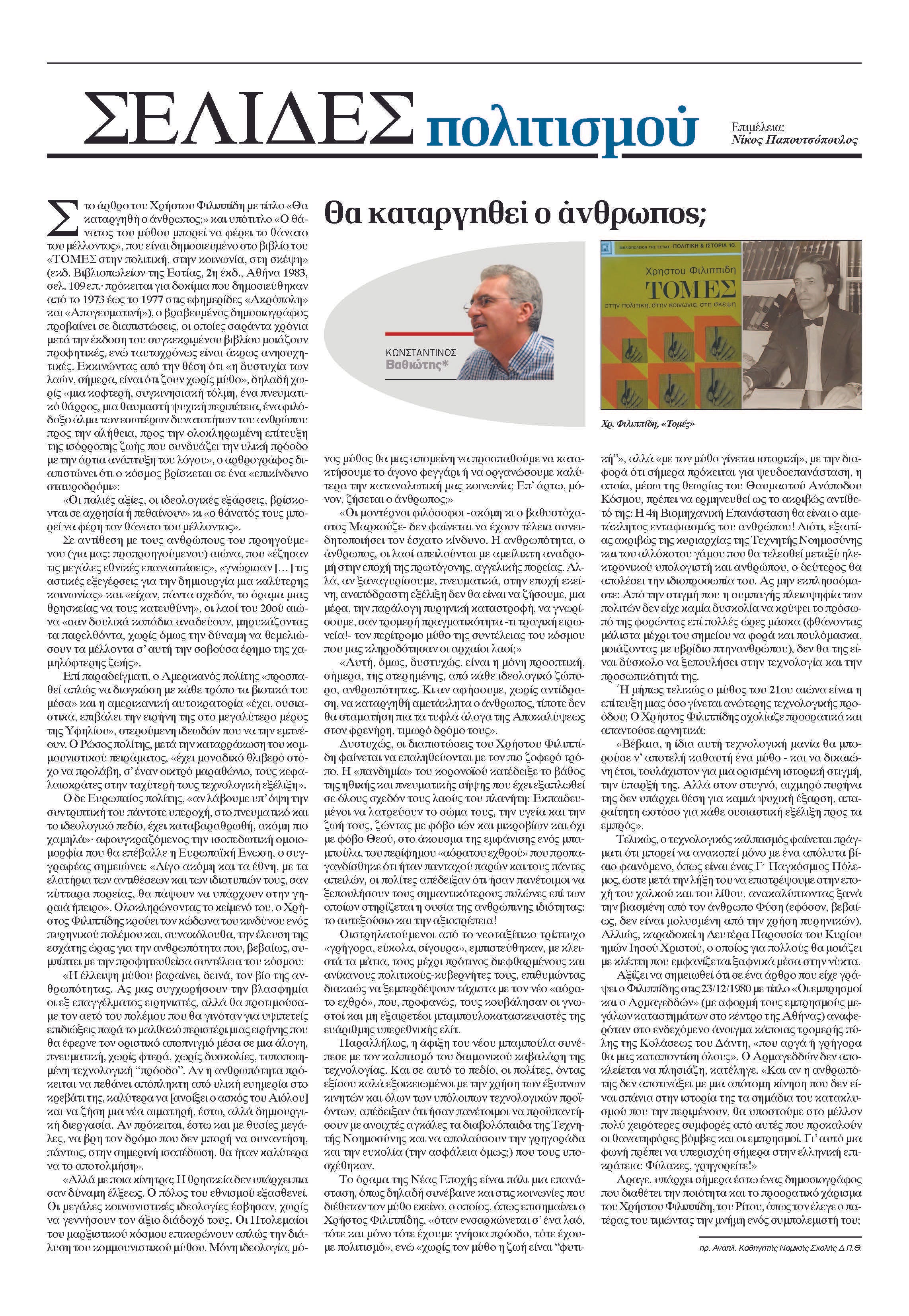 Στο άρθρο του Χρήστου Φιλιππίδη με τίτλο «Θα καταργηθή ο άνθρωπος;» και υπότιτλο «Ο θάνατος του μύθου μπορεί να φέρει το θάνατο του μέλλοντος», που είναι δημοσιευμένο στο βιβλίο του «ΤΟΜΕΣ στην πολιτική, στην κοινωνία, στη σκέψη» (εκδ. Βιβλιοπωλείον της «Εστίας», 2η έκδ., Αθήνα 1983, σελ. 109 επ.· πρόκειται για δοκίμια που δημοσιεύθηκαν από το 1973 έως το 1977 στις εφημερίδες «Ακρόπολη» και «Απογευματινή»), ο βραβευμένος δημοσιογράφος προβαίνει σε διαπιστώσεις, οι οποίες σαράντα χρόνια μετά την έκδοση του συγκεκριμένου βιβλίου μοιάζουν προφητικές, ενώ ταυτοχρόνως είναι άκρως ανησυχητικές.