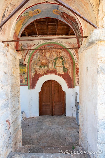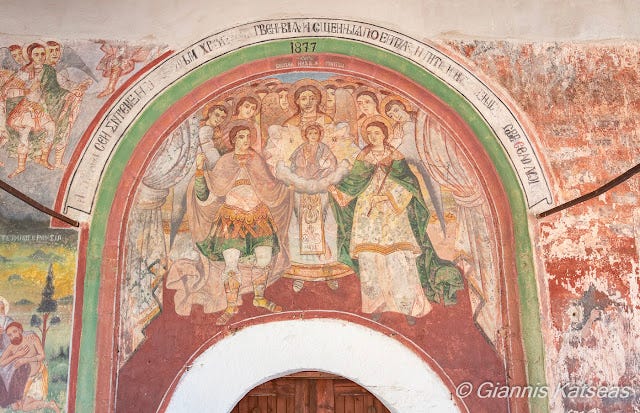 Μιά μικρή λεπτομέρεια, ὁ ὑποψιασμένος ἀναγνώστης θά διακρίνει πάνω ἀπό τήν Ἁγιογραφία τῆς κεντρικῆς θύρας τοῦ Ναοῦ τήν προσπάθεια τῶν βούλγαρων νά ἀλλάξουν τήν γραμματοσειρά της μέ βουλγαρικά γράμματα, πιθανότατα κατά τήν βουλγάρικη κατοχή ὅπου ἔγιναν στήν ὅλη περιοχή πολλαπλά ἐγκλήματα κατά τῆς προσπάθειας ἐκβουλγαρισμοῦ τῶν κατοίκων της ...