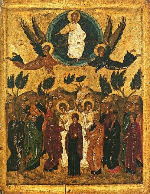 «Τότε διήνοιξεν αὐτῶν τὸν νοῦν τοῦ συνιέναι τὰς γραφάς, καὶ εἶπεν αὐτοῖς ὅτι οὕτω γέγραπται καὶ οὕτως ἔδει παθεῖν τὸν Χριστὸν καὶ ἀναστῆναι ἐκ νεκρῶν τῇ τρίτῃ ἡμέρᾳ, καὶ κηρυχθῆναι ἐπὶ τῷ ὀνόματι αὐτοῦ μετάνοιαν καὶ ἄφεσιν ἁμαρτιῶν εἰς πάντα τὰ ἔθνη, ἀρξάμενον ἀπὸ Ἱερουσαλήμ. ὑμεῖς δέ ἐστε μάρτυρες τούτων. καὶ ἰδοὺ ἐγὼ ἀποστέλλω τὴν ἐπαγγελίαν τοῦ πάτρός μου ἐφ᾿ ὑμᾶς· ὑμεῖς δὲ καθίσατε ἐν τῇ πόλει ῾Ιερουσαλὴμ ἕως οὗ ἐνδύσησθε δύναμιν ἐξ ὕψους. Ἐξήγαγε δὲ αὐτοὺς ἔξω ἕως εἰς Βηθανίαν, καὶ ἐπάρας τὰς χεῖρας αὐτοῦ εὐλόγησεν αὐτούς. καὶ ἐγένετο ἐν τῷ εὐλογεῖν αὐτὸν αὐτοὺς διέστη ἀπ᾿ αὐτῶν καὶ ἀνεφέρετο εἰς τὸν οὐρανόν. καὶ αὐτοὶ προσκυνήσαντες αὐτὸν ὑπέστρεψαν εἰς ῾Ιερουσαλὴμ μετὰ χαρᾶς μεγάλης, καὶ ἦσαν διὰ παντὸς ἐν τῷ ἱερῷ αἰνοῦντες καὶ εὐλογοῦντες τὸν Θεόν. Ἀμήν(:Τότε τοὺς μετέδωσε θεῖο φωτισμὸ καὶ τοὺς ἄνοιξε τὸν νοῦ γιὰ νὰ κατανοοῦν τίς Γραφές. Καὶ ἀφοῦ τοὺς ἀνέπτυξε τίς κυριότερες προφητεῖες, τοὺς εἶπε ὅτι ἔτσι ἔχει γραφεῖ προφητικὰ στὶς Γραφές, κι ἔτσι ἔπρεπε σύμφωνα μὲ τίς προφητεῖες αὐτὲς νὰ πάθει ὁ Χριστὸς καὶ τὴν τρίτη ἡμέρα ἀπὸ τὸν θάνατό Του νὰ ἀναστηθεῖ ἀπὸ τοὺς νεκρούς, καθὼς καὶ ὅτι πρέπει νὰ κηρυχθεῖ σὲ ὅλα τὰ ἔθνη μετάνοια καὶ ἄφεση ἁμαρτιῶν στὸ ὄνομά Του. Καὶ τὸ κήρυγμα αὐτὸ πρέπει νὰ ἀρχίσει ἀπὸ τὴν Ἱερουσαλήμ. ''Ἐσεῖς εἶστε μάρτυρες ὅλων αὐτῶν, δηλαδὴ τοῦ κηρύγματός μου, τῆς ζωῆς μου, τοῦ Πάθους μου καὶ τῆς Ἀναστάσεώς μου. Καὶ μὲ τὴ μαρτυρία ποὺ θὰ δώσετε γιὰ μένα θὰ συντελεστεῖ τὸ μεγάλο αὐτὸ ἔργο τοῦ κηρύγματος τῆς μετανοίας καὶ τῆς ἀφέσεως τῶν ἁμαρτιῶν σὲ ὅλα τὰ ἔθνη. Καὶ ἐγώ σᾶς ὑπόσχομαι νὰ σᾶς βοηθήσω ἀποτελεσματικὰ στὸ ἔργο αὐτό. Ἰδοὺ Ἐγώ, ποὺ ἀπὸ τώρα εἶμαι καὶ ὡς ἄνθρωπος ὁ Βασιλεὺς τοῦ κόσμου καὶ ἡ κεφαλὴ τῆς Ἐκκλησίας, θὰ σᾶς στείλω σὲ λίγο ἀπὸ τὸν οὐρανὸ ἐπάνω σας Αὐτὸ ποὺ σᾶς ὑποσχέθηκε ὁ Πατέρας μου, δηλαδὴ τὸ Πνεῦμα τὸ Ἅγιο. Αὐτὸ τὸ Πνεῦμα προανήγγειλαν οἱ προφῆτες ὅτι θὰ δοθεῖ σὲ κάθε ἄνθρωπο. Ἐσεῖς λοιπὸν καθίστε στὴν πόλη Ἱερουσαλὴμ καὶ μὴν ἀπομακρυνθεῖτε ἀπ᾿ αὐτήν, μέχρι νὰ φορέσετε ὡς πνευματικὸ ἔνδυμα τὴ δύναμη καὶ τὴν ἐνίσχυση ποὺ θὰ σᾶς ἔλθει ἀπὸ τὸν οὐρανὸ μὲ τὴν ἐπιφοίτηση τοῦ Ἁγίου Πνεύματος''. Ὅταν ὁ Κύριος τελείωσε τίς διδασκαλίες αὐτές, τοὺς ὁδήγησε ἔξω ἀπὸ τὰ Ἱεροσόλυμα, μέχρι ποὺ πλησίασαν στὴ Βηθανία. Καὶ ἐκεῖ ὕψωσε τὰ χέρια Του καὶ τοὺς εὐλόγησε. Καὶ καθὼς τοὺς εὐλογοῦσε, ἄρχισε νὰ ἀπομακρύνεται ἀπ᾿ αὐτοὺς καὶ νὰ ἀνεβαίνει ἐπάνω, πρὸς τὸν οὐρανό. Καὶ αὐτοί, ἀφοῦ Τὸν προσκύνησαν, ἐπέστρεψαν στὴν Ἱερουσαλὴμ μὲ μεγάλη χαρὰ γιὰ τὴν ἔνδοξη Ἀνάληψη τοῦ Διδασκάλου τους καὶ γιὰ τὴν ἐπαγγελία τοῦ Ἁγίου Πνεύματος, γιὰ τὴν ὁποία τοὺς βεβαίωσε. Καὶ ἦταν πάντοτε στὸ ἱερὸ τίς ὧρες τῆς προσευχῆς καὶ τῆς λατρείας, ὑμνῶντας καὶ δοξολογῶντας τὸν Θεό. Ἀμήν)»[Λουκᾶ 24, 45-53].