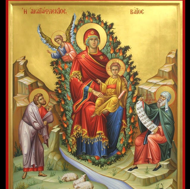 Ὅπως ἡ φλεγόμενη καὶ μὴ κατακαιόμενη βάτος ἔτσι καὶ ἡ Παρθένος Μαρία, ἂν καὶ γεννᾶ τὸ «Φῶς», ἐν τούτοις παραδόξως δὲν «φθείρεται».