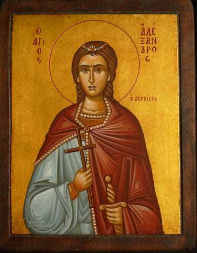 Ἤθλησας νομίμως ὑπὲρ Χριστοῦ, Ἀλέξανδρε Μάρτυς, καὶ καθεῖλες τὸν δυσμενῆ· ὅθεν σου τὴν μνήμην, Θεσσαλονίκη ἄγει, τιμῶσα τοὺς ἀγῶνας, τῆς σῆς ἀθλήσεως.