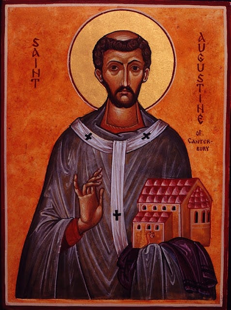 Ὁ Ἐπίσκοπος Ρώμης Γρηγόριος ὁ Μέγας († 12 Μαρτίου), ἐκπληρώνοντας παλαιὸ διακαὴ πόθο του νὰ ἐκχριστιανίσει τοὺς Ἀγγλοσάξονες, ἀπέστειλε ἐκεῖ τὸν Ἅγιο Αὐγουστίνο, μοναχὸ τοῦ ἁγίου Ἀνδρέου τῆς ὁμώνυμης μονῆς στὴ Ρώμη, συνοδευόμενο ἀπὸ σαράντα μοναχούς, γιὰ νὰ ἀναλάβει τὸ ἔργο αὐτό.