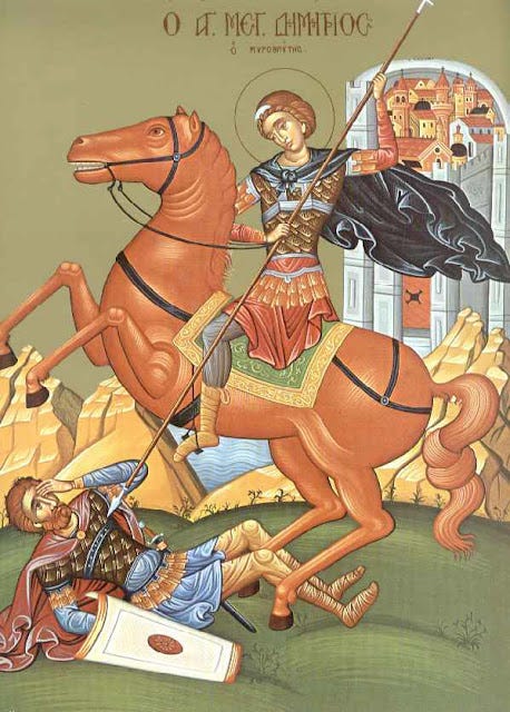 Εὐσεβείας τοῖς τρόποις καταπλουτῶν, ἀσεβείας τὴν πλάνην καταβαλών, Μάρτυς κατεπάτησας, τῶν τυράννων τὰ θράση, καὶ τῷ θείῳ πόθῳ, τὸν νοῦν πυρπολούμενος, τῶν εἰδώλων τὴν πλάνην, εἰς χάος ἐβύθισας· ὅθεν ἐπαξίως, ἀμοιβὴν τῶν ἀγώνων, ἐδέξω τὰ θαύματα, καὶ πηγάζεις ἰάματα, Ἀθλοφόρε Δημήτριε, πρέσβευε Χριστῷ τῷ Θεῷ, τῶν πταισμάτων ἄφεσιν δωρήσασθαι, τοῖς ἑορτάζουσι πόθῳ, τὴν ἁγίαν μνήμην σου.