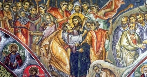 «Ὁ δὲ παραδιδοὺς αὐτὸν ἔδωκεν αὐτοῖς σημεῖον λέγων· ὃν ἂν φιλήσω, αὐτὸς ἐστι· κρατήσατε αὐτόν. καὶ εὐθέως προσελθὼν τῷ Ἰησοῦ εἶπε· χαῖρε, ῥαββί, καὶ κατεφίλησεν αὐτόν (:ἐκεῖνος μάλιστα ποὺ τὸν παρέδωσε, εἶχε δώσει σ᾿ αὐτοὺς συνθηματικὸ λέγοντας: ''Ἐκεῖνον ποὺ θὰ φιλήσω, αὐτὸς εἶναι· πιάστε τον προσέχοντας καλὰ μὴ σᾶς φύγει''. Καὶ ἀμέσως πλησίασε τὸν Ἰησοῦ καὶ τοῦ εἶπε: ''Χαῖρε, διδάσκαλε''. Καὶ τὸν φίλησε μὲ προσποιητὴ ἐγκαρδιότητα)» [Ματθ. 26,48].