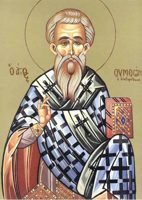 Ὡς ἀστέρα μέγιστον ἡ Ἐκκλησία, κεκτημένη σήμερον, τὸν θεηγόρον Συμεών, φωταγωγεῖται κραυγάζουσα· χαίροις Μαρτύρων σεπτὸν ἀκροθίνιον.