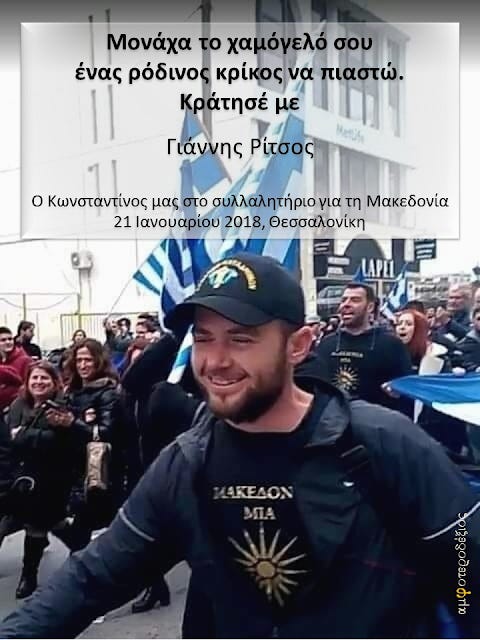 Καμμιὰ ἀμφιβολία δὲν ἔχουμε - τὸ ἰλαρό σου πρόσωπο μᾶς τὸ βεβαιώνει - πὼς ἑνώθηκες μὲ τοὺς ἥρωες καὶ ἁγίους, καὶ πὼς λυπᾶστε καὶ χαίρεστε καὶ τὰ λέτε ὅλοι μαζί : μὲ τὸν Μεγαλέξανδρο, μὲ τὸν Κων/νο Παλαιολόγο, μὲ τὸν ἅγιο Ἰωάννη Βατάτζη, τὸν ἅγιο καὶ μέγα Κων/νο,τὸν Ἰωάννη Καποδίστρια, τὸν Ἀθανάσιο Διάκο, τὸν Παῦλο Μελᾶ, τὸν Εὐαγόρα Παλλικαρίδη, τὸν Θεόδωρο Κολοκοτρώνη, τὸν Ἀριστοτέλη Γκούμα, τὸν Τάσο Ἰσαάκ καὶ τὸν Σολομοῦ, τὸν Νικόλαο Καπετανίδη, τὸν Κων/νο Κουκίδη, τὸν Γρηγόριο Αύξεντίου καὶ ὅλους τοὺς καλῶς ἀθλήσαντας ἁγίους καὶ ἥρωες μάρτυρες καὶ πὼς ΟΛΟΙ ΜΑΖΙ, μὲ τὸ δεξὶ πόδι τοῦ τσολιᾶ ποὺ θὰ κτυπήσῃ, θὰ σηκωθεῖτε, ΚΑΙ ΟΛΟΙ ΜΑΖΙ ,ζωντανοὶ καὶ ὰπεθαμένοι-ἀθάνατοι, θὰ καμακώσουμε τὸ θεριὸ μὲ τὸ καμάκι τοῦ ἥλιου!!