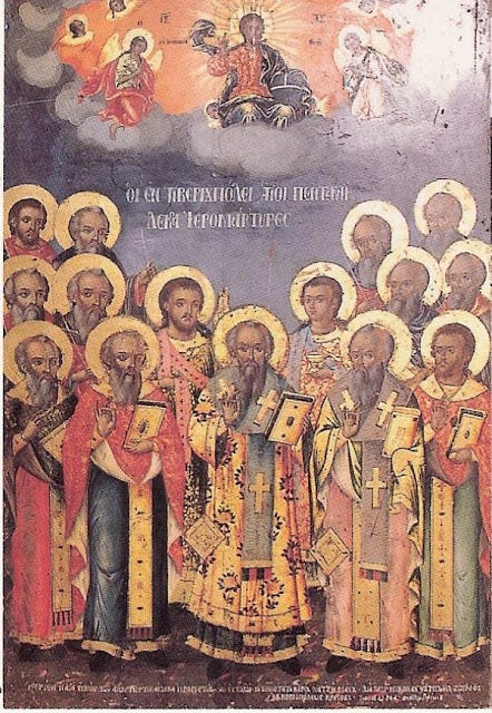 Φωστῆρες ὑπέρλαμπροι τῆς Ἐκκλησίας Χριστοῦ, τὸν κόσμον ἐφωτίσατε ταῖς διδαχαῖς ὑμῶν, Πατέρες θεόσοφοι· τήξαντες τὰς αἱρέσεις, πάντων τῶν κακοδόξων, σβέσαντες τὰς φλογώδεις, τῶν βλασφήμων συγχύσεις· διὸ ὡς Ἱεράρχαι, Χριστῷ πρεσβεύσατε σωθῆναι ἡμᾶς.