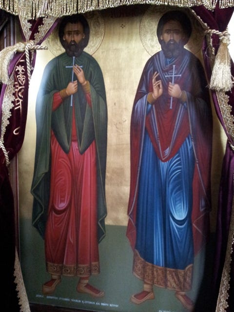 Δι’ ἐγκρατείας τῶν παθῶν τὰς πυριφλέκτους, ἀπονεκρώσαντες ὁρμὰς καὶ τὰς κινήσεις, τοῦ Χριστοῦ οἱ Μάρτυρες ἔλαβον τὴν χάριν, τὰς νόσους ἀποδιώκειν τῶν ἀσθενῶν, καὶ ζῶντες καὶ μετὰ τέλος θαυματουργεῖν, ὄντως θαῦμα παράδοξον! ὅτι ὀστέα γυμνά, ἐκβλύζoυσιν ἰάματα. Δόξα τῷ μόνῳ Θεῶ ἡμῶν.