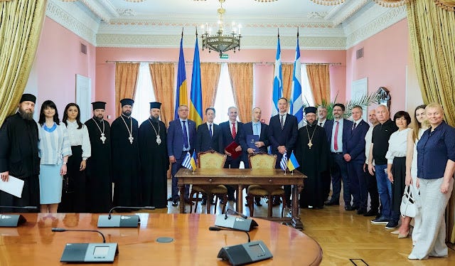 Καί τί περιλαμβάνει τό μνημόνιο; Θαυμάστε: «ἀνάπτυξη διμεροῦς συνεργασίας σέ πνευματικούς καί ἐκπαιδευτικούς τομεῖς καί εὐρύ φάσμα συνεργατικῶν πρωτοβουλιῶν, συμπεριλαμβανομένων ἀκαδημαϊκῶν ἀνταλλαγῶν μεταξύ θεολογικῶν σχολῶν στήν Οὐκρανία καί τήν Ἑλλάδα, ὑποτροφίες γιά φοιτητές καί μεταπτυχιακούς φοιτητές, παροχή νεοελληνικῆς θεολογικῆς βιβλιογραφίας στίς οὐκρανικές βιβλιοθῆκες (σ.σ. θά πάει σύννεφο ὁ Φάρος, ὁ Λίβυος καί ὁ Θερμός) καί ἐπίσης κοινά συνέδρια, σεμινάρια, θερινά σχολεῖα καί διαθρησκευτικά φόρουμ μέ στόχο τήν προώθηση τῆς εἰρήνης καί τῆς ἀμοιβαίας κατανόησης (σ.σ. ἤδη τό ψευτοθεολογικό ἐκμαυλιστήριο τοῦ Βόλου τρέχει ἐδῶ καί χρόνια τέτοιες δράσεις), ἐνῷ ἰδιαίτερη προσοχή θά δοθεῖ στήν ἐμβάθυνση τῆς συνεργασίας μέ κορυφαῖες θεολογικές σχολές στήν Ἑλλάδα - στή Θεσσαλονίκη, τήν Ἀθήνα καί ἱδρύματα τῆς Ἐκκλησίας τῆς Ἑλλάδος».