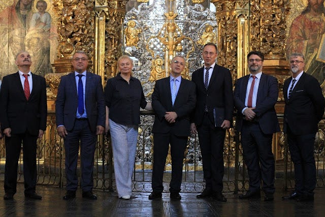 Καί ἐνῷ ὁ διωγμός συνεχίζεται, ἡ ἐπίσημη Ἑλλάδα συνεχίζει καί αὐτή ξεδιάντροπα τίς ἀγκαλιές της μέ τούς σταυρωτῆδες τῆς Ὀρθοδοξίας, καθώς ἀκριβῶς μία ἡμέρα μετά τους τραμπουκισμούς, στίς 18 Ἰουνίου, στήν κατοικία τοῦ ψευτομητροπολίτη Κιέβου Ἐπιφανίου ὑπογράφηκε θρησκευτικό Μνημόνιο Συνεργασίας μεταξύ Οὐκρανίας καί Ἑλλάδας. Τό ὑπέγραψαν ὁ Βίκτορ Γιελένσκι, ἐπί κεφαλῆς τῆς Κρατικῆς Ὑπηρεσίας τῆς Οὐκρανίας γιά τήν Ἐθνοπολιτική καί τήν Ἐλευθερία Συνείδησης (ἐδῶ γελᾶμε μετά δακρύων) καί τόν Γενικό Γραμματέα Θρησκευτικῶν Ὑποθέσεων στό ἡμέτερο Ὑπουργεῖο Παιδείας Γιῶργο Καλαντζῆ, πού προφανῶς κάνει πολύ καλά τήν...δουλειά του ὡς θρησκετικός γκαουλάιτερ τῆς ἀποικίας γιά νά εἶναι στή συγκεκριμένη θέση ἐδῶ καί 14 ὁλόκληρα χρόνια καί ἀνεξαρτήτως κυβερνήσεων (ὥστε νά μήν εἶναι ὑπερβολή νά πεῖ κανείς ὅτι ἄν πέσουν πυρηνικά στήν Ἑλλάδα, δύο εἴδη θά ἐπιζήσουν: οἱ κατσαρίδες καί ὁ Καλαντζῆς).