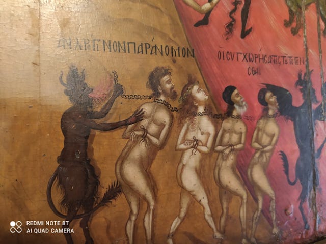 Στὰ Χανιὰ, στὴν παλαιὰ Μητρόπολι, ὑπάρχει μιὰ παληὰ εἰκόνα τῆς μελλούσης κρίσεως, ποὺ ἔχει τοποθετηθῇ στὸ παρεκκλήσι τῶν ἁγίων Παΐσίου καὶ Πορφυρίου. Ἐκεῖ παρουσιάζονται καὶ οἱ διάφορες κατηγορίες ἁμαρτωλῶν πρὸς γνῶσι καὶ συμμόρφωσι τῶν ἐκκλησιαζομένων. Ἐκεῖ, λοιπὸν, ὑπάρχουν καὶ δύο διάβολοι οἱ ὁποῖοι ὁδηγοῦν στὴν λίμνη τοῦ πυρὸς, τὴν καιομένην ἐν θείῳ, ἕνα ἄνδρα καὶ μία γυναῖκα μὲ τὰ χέρια δεμένα πίσω καὶ μὲ ἀλυσίδα στὸν λαιμό. Ἐπάνω ὑπάρχει ἡ ἐπιγραφὴ τῆς αἱτίας: ἈΝΔΡΌΓΙΝΟΝ ΠΑΡΆΝΟΜΟΝ (μὲ αὐτὴν τὴν ὀρθογραφία). Βλέπετε πόση σημασία ἐδίδετο στὴν νομιμότητα τοῦ ἀνδρογύνου. (Φανταστεῖτε νὰ ζοῦσαν σήμερα αὐτοὶ οἱ ἄνθρωποι,ποὺ σκεφτόταν ἔτσι, καὶ νἄβλεπαν αὐτὰ ποὺ λέγονται καὶ γίνονται μὲ τοὺς «γάμους» καὶ τὶς «οἰκογένειες» ἐκφύλων καὶ τὴν προσπάθεια νομιμοποιήσεώς τους....)
