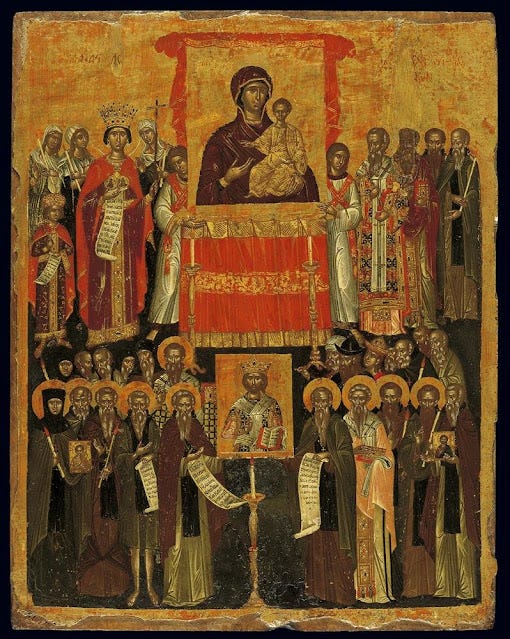 Οἱ Πατέρες τῆς Ἐκκλησίας μας ὅρισαν νὰ ἑορτάζεται ἡ ἡμέρα αὐτὴ σὲ ἀνάμνηση τῆς παύσης τῆς εἰκονομαχίας καὶ τῆς ὁριστικῆς ἀναστήλωσης τῶν ἱερῶν εἰκόνων ἀπὸ τὴν εὐσεβῆ βασίλισσα τοῦ Βυζαντίου Θεοδώρα (μετέπειτα ἁγία τῆς Ἐκκλησίας μας) στὶς 4-3-843. Τὸ γεγονὸς αὐτὸ θεωρήθηκε μείζονος σημασίας διότι μὲ τίς ἀποφάσεις τῆς Ζ΄ Οἰκουμενικῆς Συνόδου (787), ὁλοκληρώθηκε ἡ διατύπωση τῆς δογματικῆς διδασκαλίας τῆς Ἐκκλησίας μας (τριαδολογικὸ καὶ χριστολογικὸ δόγμα). Ἡ εἰκονομαχικὴ ἔριδα (726-843) ὑπῆρξε ἄλλωστε ἕνας θλιβερὸς σταθμὸς τῆς ἐκκλησιαστικῆς ἱστορίας, ἡ ὁποία προξένησε ἀφάνταστη φθορὰ στὸ σῶμα τῆς Ἐκκλησίας. Μέσα ὅμως ἀπὸ αὐτὴ τὴ λαίλαπα βγῆκε καὶ κάτι θετικό, ἡ διατύπωση τῆς θεολογίας τῶν ἱερῶν εἰκόνων, ἡ ὁποία κατ᾿ οὐσίαν, ὅπως θὰ δοῦμε, εἶναι ἐπέκταση καὶ ἀνάπτυξη τοῦ χριστολογικοῦ δόγματος.