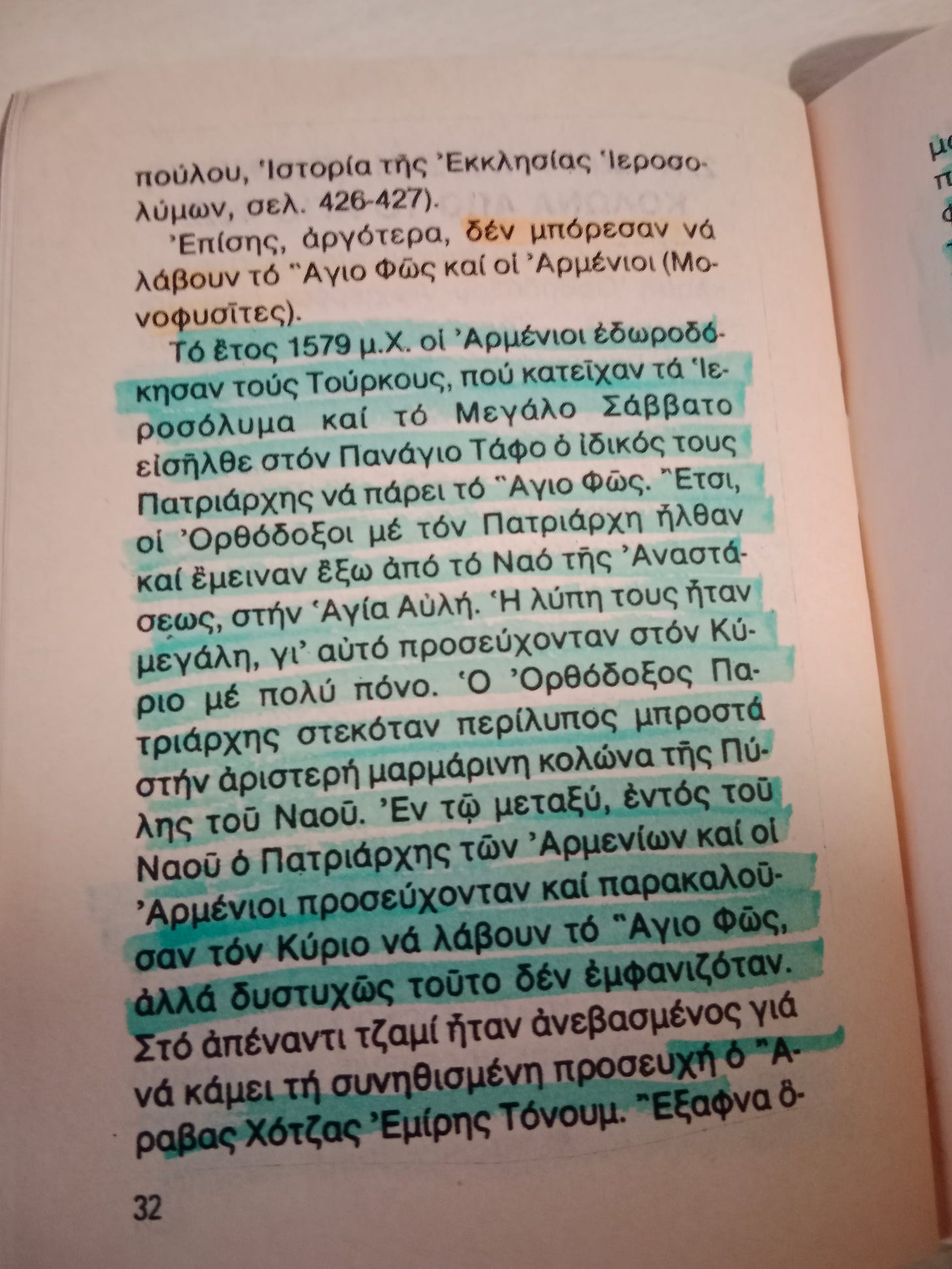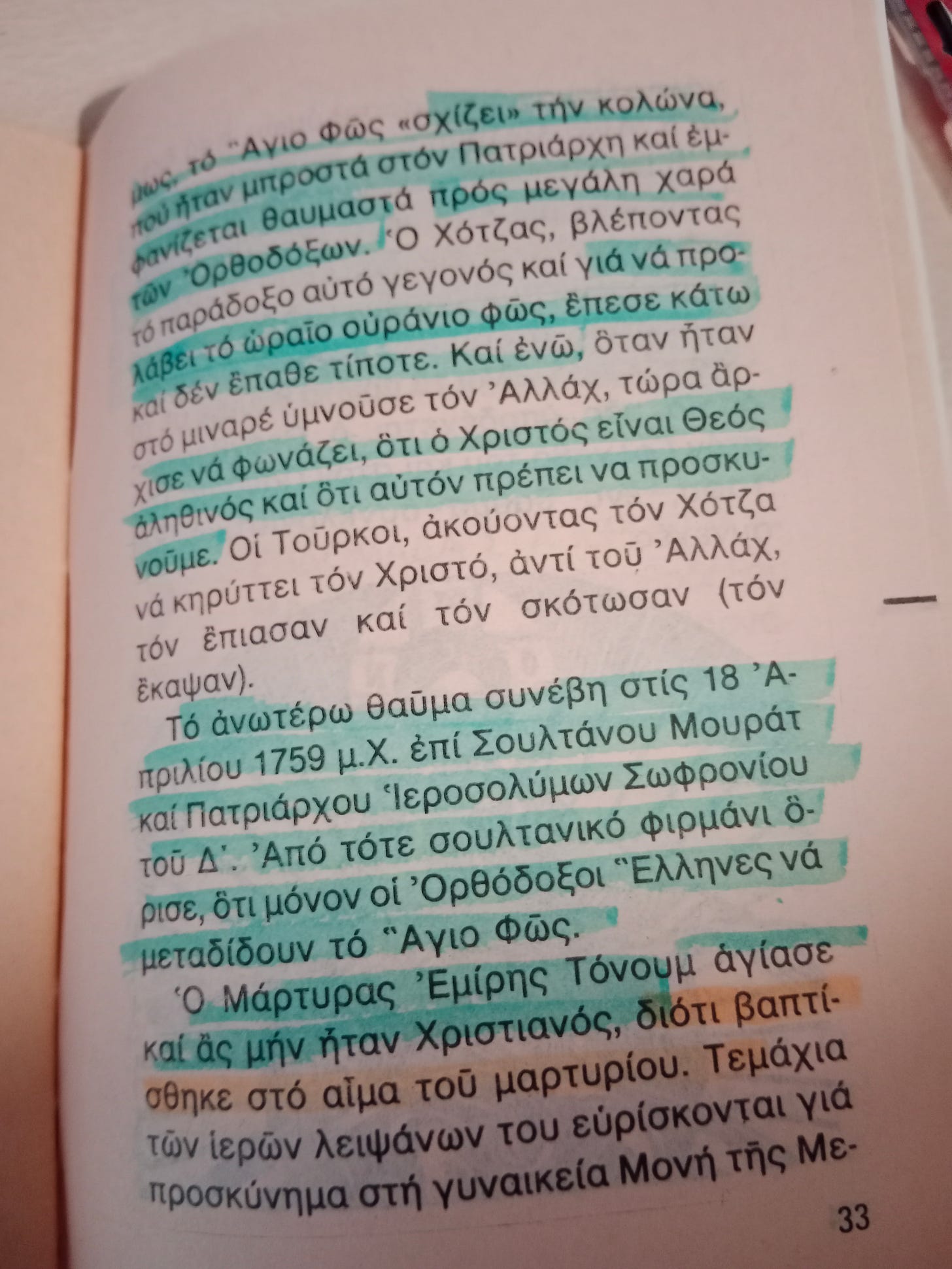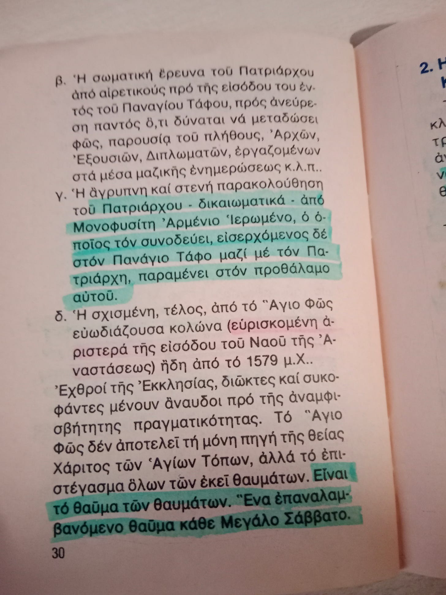 Δ) Η σχισμένη, τέλος, από το Άγιο Φως ευωδιάζουσα κολώνα (ευρισκομένη αριστερά της εισόδου του Ναού της Αναστάσεως) ήδη από το 1579. Το έτος 1579 μ.Χ. οι Αρμένιοι εδωροδόκησαν τους Τούρκους, που κατείχαν τα Ιεροσόλυμα και το Μεγάλο Σάββατο εισήλθε στον Πανάγιο Τάφο ο ιδικός τους Πατριάρχης να πάρει το Άγιο Φως. Έτσι, οι Ορθόδοξοι με τον Πατριάρχη ήλθαν και έμειναν έξω από τον Ναό της Αναστάσεως, στην Αγία Αυλή. Η λύπη τους ήταν μεγάλη, γι’ αυτό προσεύχονταν στον Κύριο με πολύ πόνο. Ο Ορθόδοξος Πατριάρχης στεκόταν περίλυπος μπροστά στην αριστερή μαρμάρινη κολώνα της Πύλης του Ναού. Εν τω μεταξύ, εντός του Ναού ο Πατριάρχης των Αρμενίων και οι Αρμένιοι προσεύχονταν και παρακαλούσαν τον Κύριο να λάβουν το Άγιο Φως, αλλά δυστυχώς τούτο δεν εμφανιζόταν. Στο απέναντι τζαμί ήταν ανεβασμένος για να κάμει την συνηθισμένη προσευχή ο Άραβας Χότζας Εμίρης Τόνουμ. Έξαφνα όμως, το Άγιο Φως “σχίζει” την κολώνα, που ήταν μπροστά στον (Ορθόδοξο) Πατριάρχη και εμφανίζεται θαυμαστά προς μεγάλη χαρά των Ορθοδόξων. Ο Χότζας, βλέποντας το παράδοξο αυτό γεγονός και για να προλάβει το ωραίο ουράνιο φως, έπεσε κάτω και δεν έπαθε τίποτε. Και ενώ, όταν ήταν στον μιναρέ υμνούσε τον Αλλάχ, τώρα άρχισε να φωνάζει, ότι ο Χριστός είναι Θεός αληθινός και ότι Αυτόν πρέπει να προσκυνούμε. Οι Τούρκοι, ακούοντας τον Χότζα να κηρύττει τον Χριστό, αντί του Αλλάχ, τον έπιασαν και τον σκότωσαν (τον έκαψαν). Το ανωτέρω θαύμα συνέβη στις 18 Απριλίου 1579 επί Σουλτάνου Μουράτ και Πατριάρχου Ιεροσολύμων Σωφρονίου του Δ΄. Από τότε, σουλτανικό φιρμάνι όρισε ότι μόνον οι Ορθόδοξοι Έλληνες θα μεταδίδουν το Άγιο Φως. Ο Μάρτυρας Εμίρης Τόνουμ αγίασε και ας μην ήταν Χριστιανός, διότι βαπτίσθηκε στο αίμα του μαρτυρίου του. Η ιερά κολώνα που “διερράγη” σώζεται μέχρι σήμερα, μαυρισμένη, αλλά και ευωδιάζουσα. Εμείς οι Ορθόδοξοι, πριν μπούμε στον Ναό της Αναστάσεως, την ασπαζόμεθα στην σχισμή για ευλογία».
