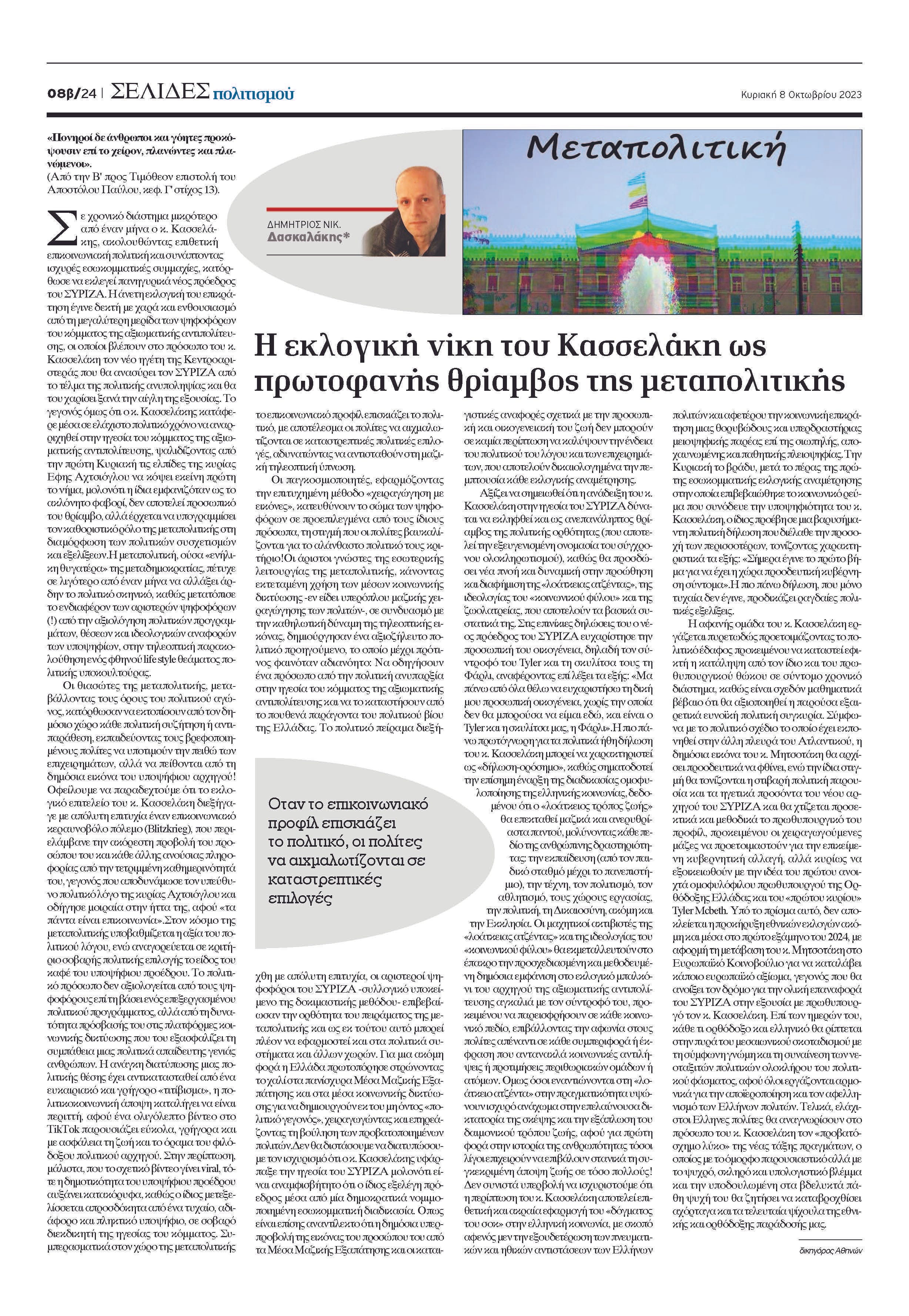 Δεν συνιστά υπερβολή να ισχυριστούμε ότι η περίπτωση του κ. Κασσελάκη αποτελεί επιθετική και ακραία εφαρμογή του «δόγματος του σοκ» στην ελληνική κοινωνία με σκοπό αφενός μεν την εξουδετέρωση των πνευματικών και ηθικών αντιστάσεων των Ελλήνων πολιτών και αφετέρου την κοινωνική επικράτηση μιας θορυβώδους και υπερδραστήριας μειοψηφικής παρέας επί της σιωπηλής, αποχαυνωμένης και παθητικής πλειοψηφίας.