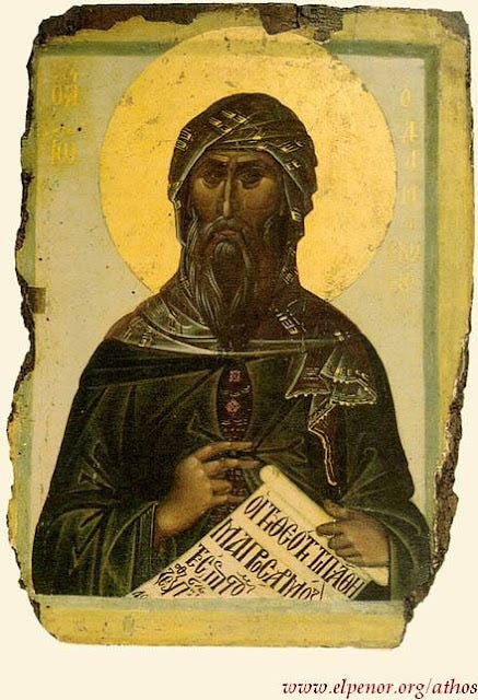 Δαμάσας πολλοῖς, ἱδρῶσι τῆς ἀσκήσεως, τὸ σῶμα τὸ σόν, εἰς ὕψος οὐράνιον, εὐπετῶς ἀνέδραμες, ὅπου μέλη θεῖά σοι δίδονται, ἃ τρανῶς ἐμελῴδησας, τοῖς φίλοις Κυρίου Πάτερ Ὅσιε.