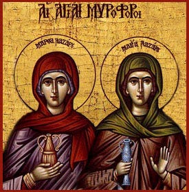 Χαίρετε αὐτάδελφοι ἱεραί, Μάρθα καὶ Μαρία, σεμναὶ ἤθεσι καὶ ζωῇ· χαίρετε Λαζάρου, αἱ σύγγονοι αἱ θεῖαι, μεθ’ ὧν ἡμῖν αἰτεῖσθαι, τὸ θεῖον ἔλεος.