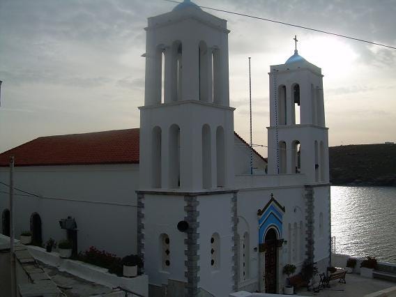Κάτασπρη και μεγαλόπρεπη υψώνεται κοντά στο όμορφο λιμάνι η Εκκλησιά της Παναγίας της Θεοσκέπαστης, που γιορτάζει του Ακαθίστου Ύμνου.